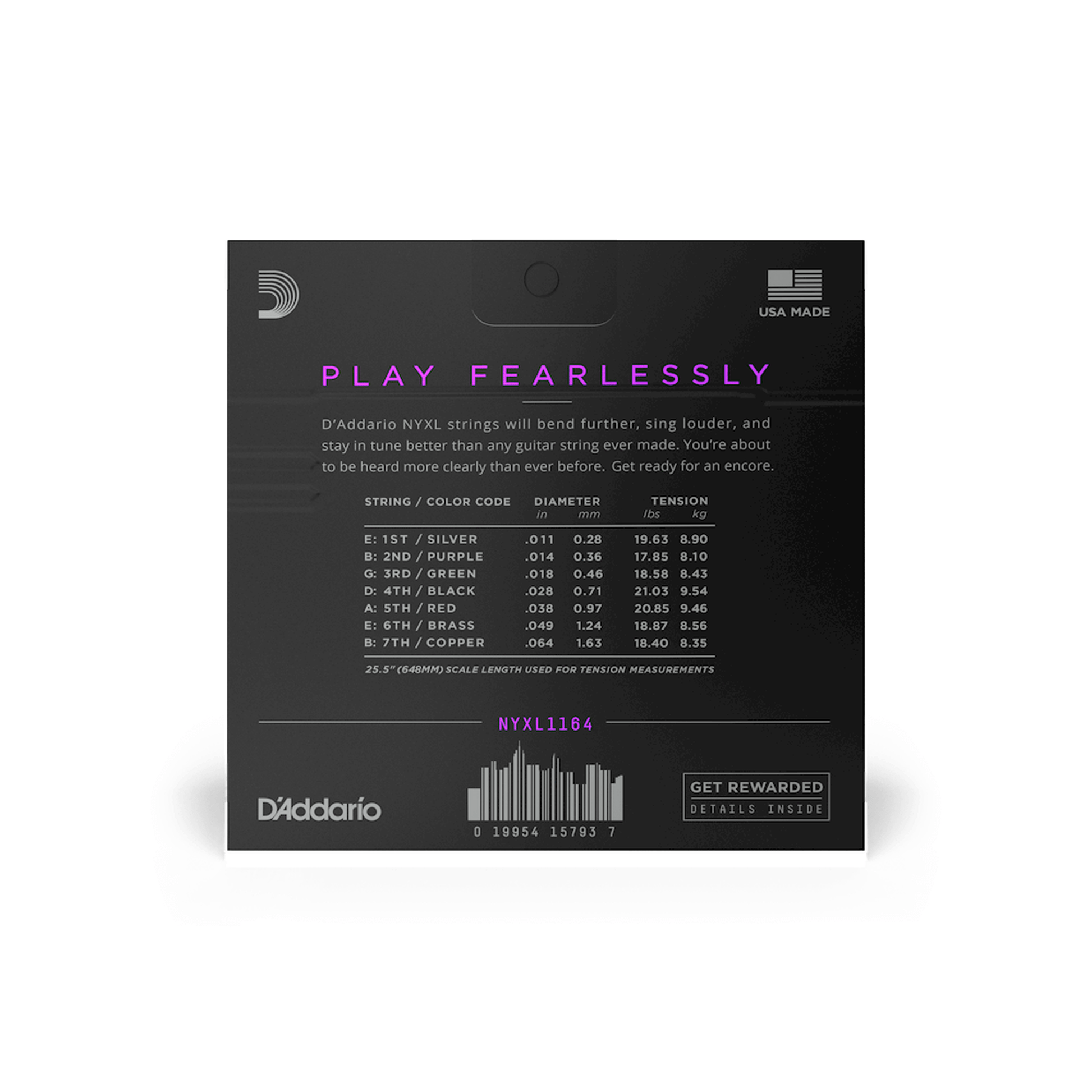 NYXLs will bend farther, sing louder, and stay in tune better than any string you’ve played before. As our premium uncoated electric string, NYXLs offer higher break strength, enhanced tuning stability, and accentuated mid-range frequency response, providing more presence and crunch to cut through the mix. Made with a NY Steel core, premium nickel-plated steel wrap wire, and Fusion Twist technology, NYXL electric guitar strings are tough enough and versatile enough to handle anything. This 11-64 Medium 7-String set is designed with larger gauges for moderate flexibility and a full tone.