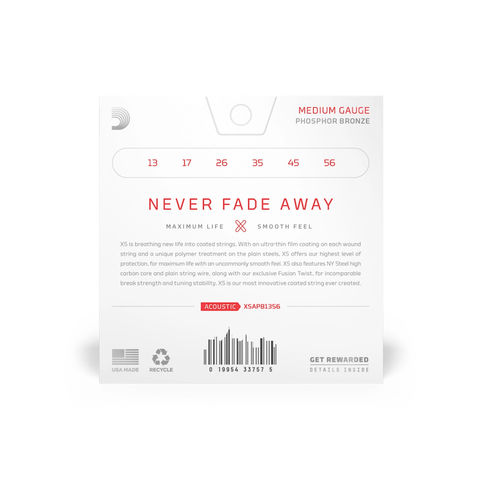 Born from our greatest breakthrough in string innovation, XS Phosphor Bronze strings have the longest life of any D’Addario acoustic guitar string. The XS coating gives our warm, balanced phosphor bronze strings maximum life, with an uncommonly smooth feel. Made with a NY Steel core, phosphor bronze wrap wire, and Fusion Twist technology, XS coated acoustic guitar strings have incomparable break strength and tuning stability, in addition to their dramatically increased lifespan. 13-56 Medium gauge strings provide maximum volume and projection, with more tension and resistance.