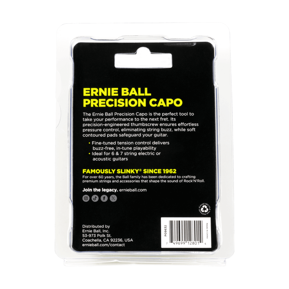 The Ernie Ball Precision Capo is the perfect tool to take your performance to the next fret. Its precision engineered thumbscrew ensures effortless pressure control, eliminating string buzz, while soft contoured pads safeguard your guitar’s neck and finish. Lightweight, durable, and built to last, it’s the ultimate capo for delivering reliable performance.