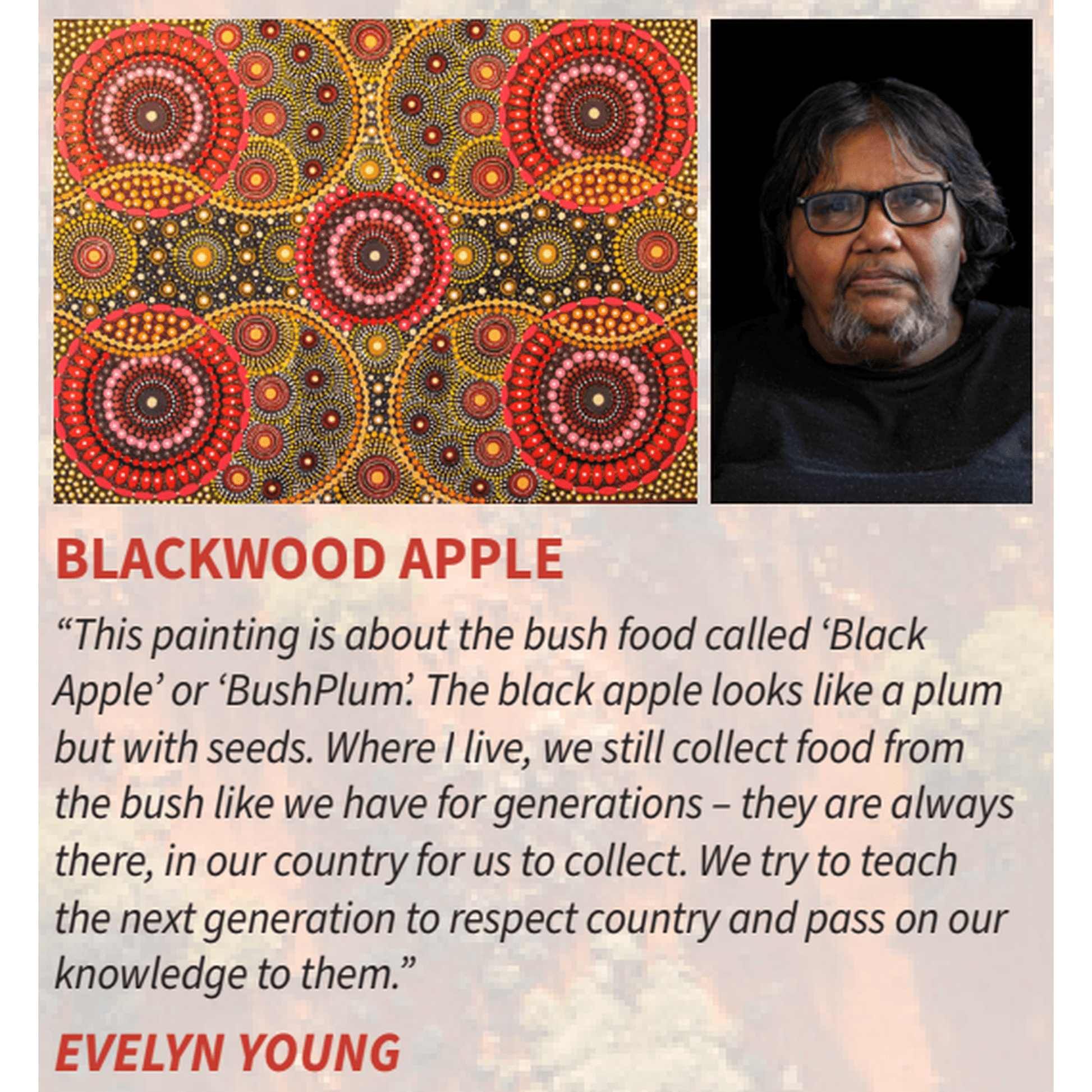 The featured design, *Blackwood Apple* by Evelyn Young, represents the bush food known as the Black Apple or Bush Plum. Evelyn describes her piece: