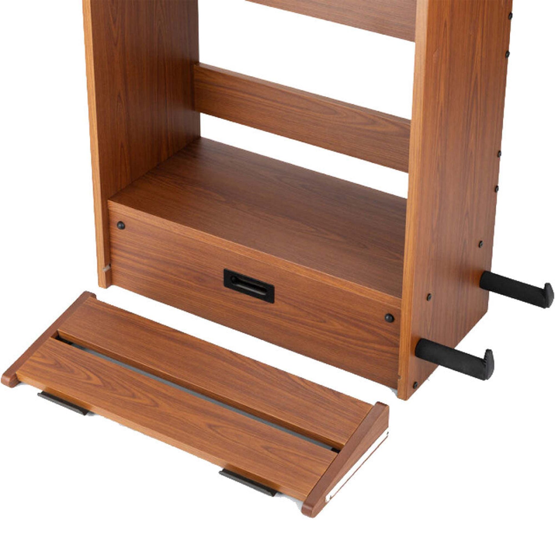 The pedalboard at the bottom holds several guitar-effect pedals and, at 8 inches wide, accommodates a variety of stompbox sizes. An opening down the center of the board makes it easy to route your wires and cables for a clean and practical layout. Hook-and-loop strips are included for securing your devices to the shelves, a popular attachment method that enables ease of rearrangement if you decide to make changes to your setup. When it's time to play, the pedalboard completely slides out of the workstation and can be positioned as close to or as far away from your amp as you choose. When you're finished playing you can slide the board back into the workstation and close the bottom door to shield your pedals from dust, debris, and mishaps.