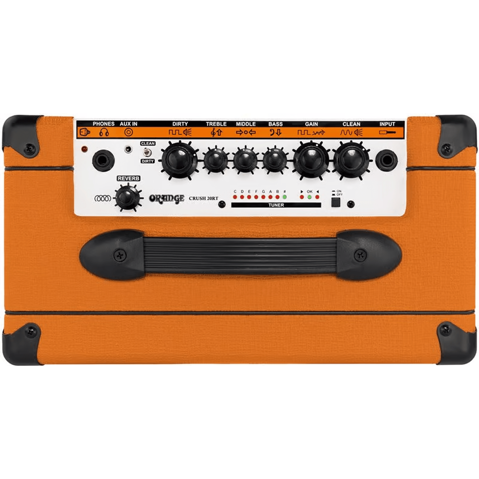 The Crush 20RT builds on the tonal platform of the Crush 20 with even more functionality due to the inclusion of a lush onboard reverb and an integrated chromatic tuner. Like its more ‘stripped down’ sibling, the Crush 20RT features footswitchable Clean and Dirty channels plus our new high gain, four stage preamp design, serving up a huge palette of overdriven and distorted sounds, rich in harmonic overtones.