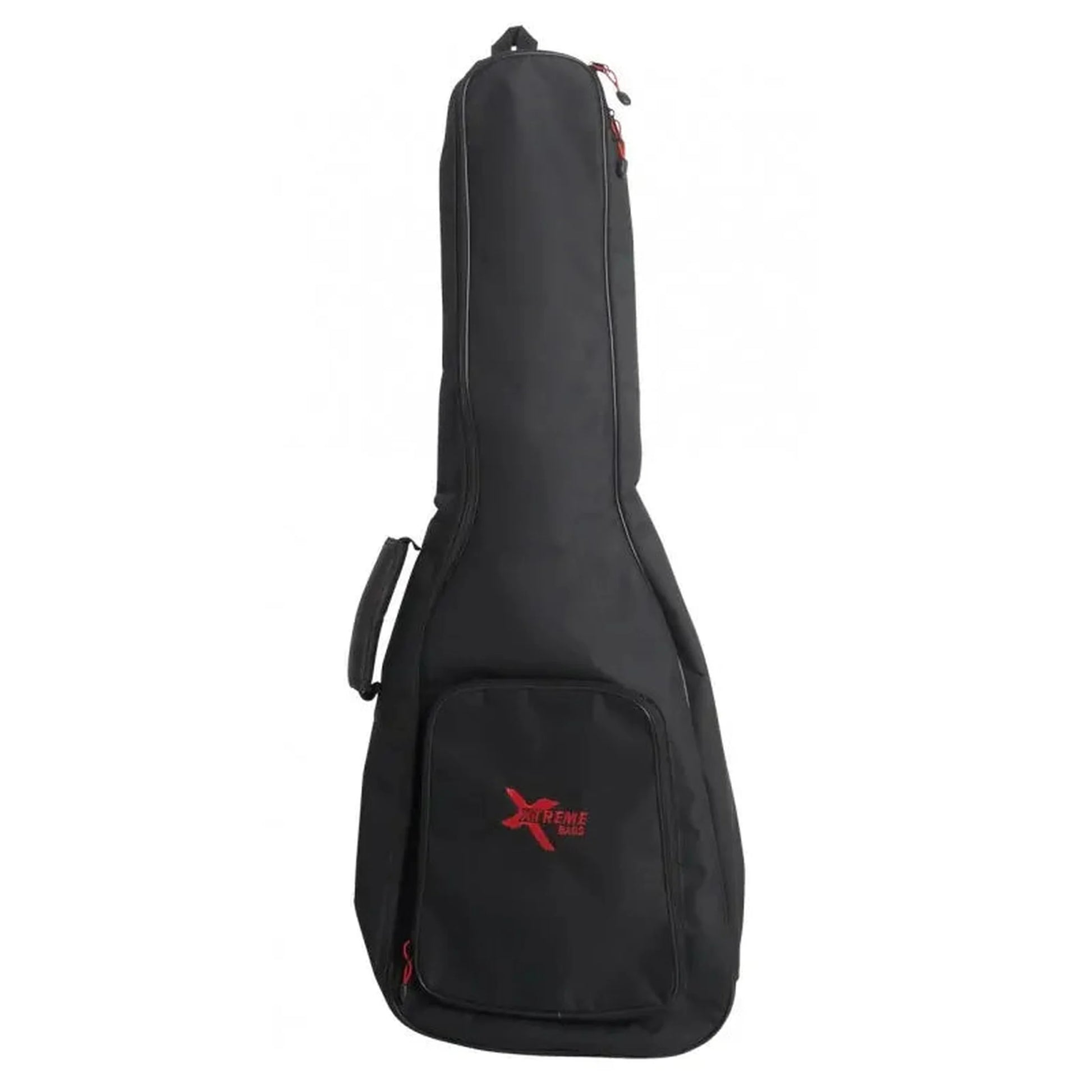 XTREME - Black Heavy Duty Nylon Classical 3/4 Guitar Bag waterproof yarn 5mm sponge padded and lined. Reinforced at headstock and bridge. Full length zip. 1 accessory pocket. Cross stitched cushioned carry handle. 2 adjustable shoulder straps with comfort pads. Rubber tread. Toggles to all zips. Embroidered Xtreme logo.