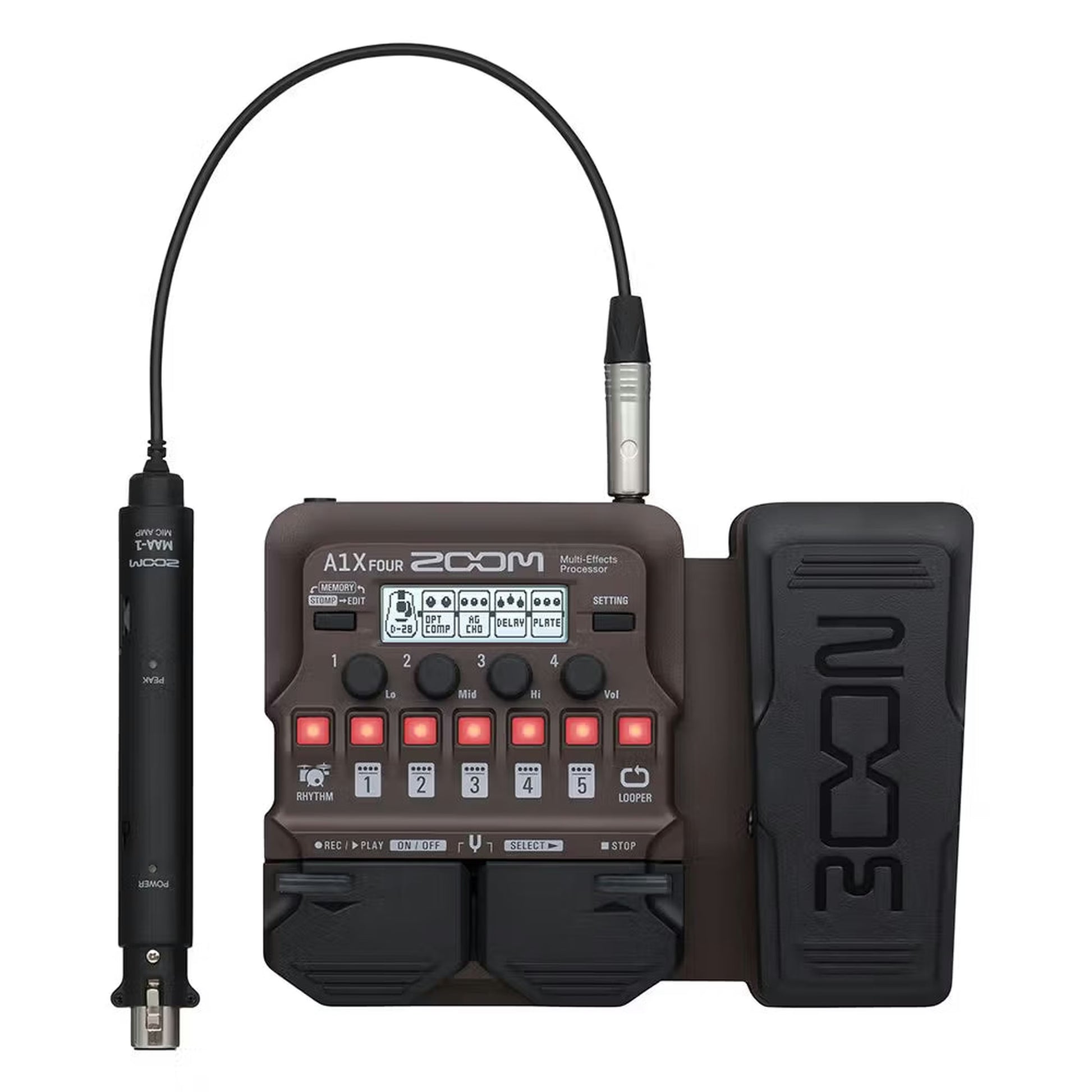The Zoom A1X FOUR is a powerful multi‑effects pedal engineered specifically for acoustic instruments. Tailored for guitarists — but also usable with sax, trumpet, violin, harmonica, and even upright bass — it brings together a versatile toolbox of tone shaping, looping, and performance features.